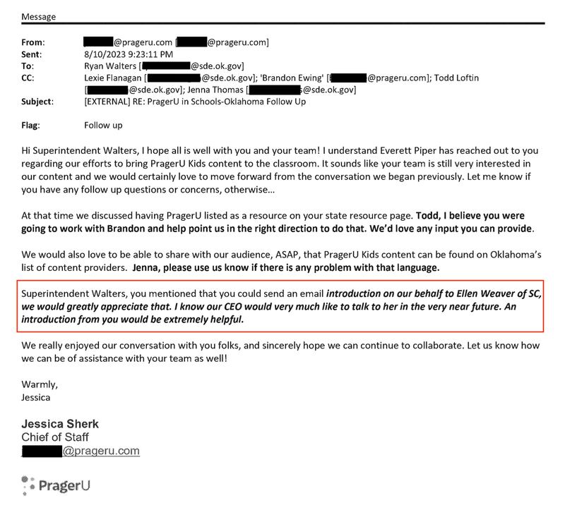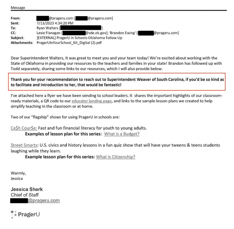 An August 2023 e-mail from PragerU’s Jessica Sherk to State Superintendent asks Public Instruction Ryan Walters if he could introduce the conservative advocacy group contact South Carolina officials.Oklahoma State Department of Education