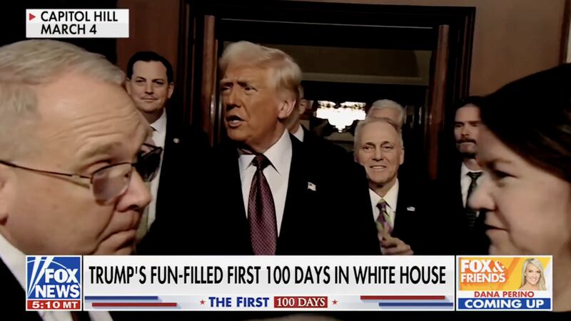 The Fox News chyron read “Trump’s fun-filled first 100 days in White House.”Fox News
