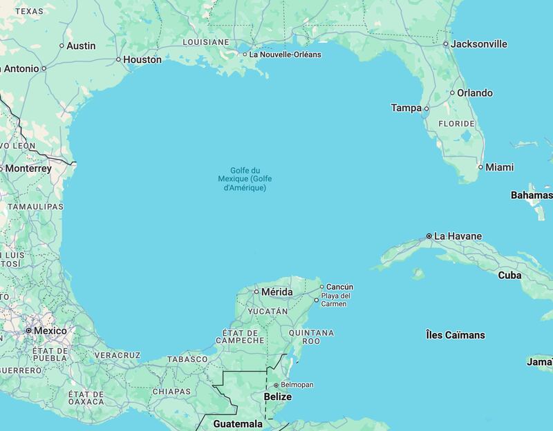 A Google Maps view of the Gulf of Mexico accessed by a French user shows the body of water is also displayed as the Gulf of America.Google Maps