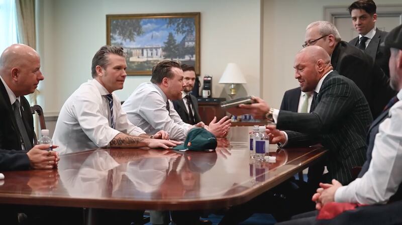 Phil Hegseth (center left) during Sec. of Defense Pete Hegseth’s meeting with MMA fighter Conor McGregor at the Pentagon.US Department of Defense/Facebook