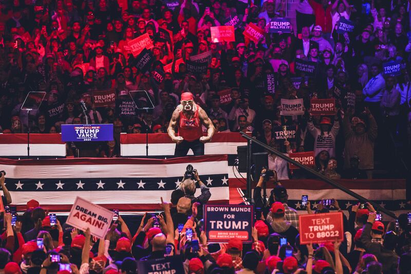 Hulk Hogan interacts with crowd at a rally for former US President and presidential candidate Donald Trump October 27, 2024 at Madison Square Garden in New York, New York.Sacha Lecca/Rolling Stone via Getty Images