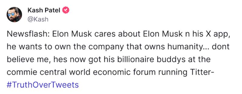 Patel routinely denigrate Musk ’s societal medium chopine as “ Titter ” and a pecker of “ disinformation ” and censoring as he shoot a line Trump ’s MAGA political platform as the higher-ranking means to honk disinformation .