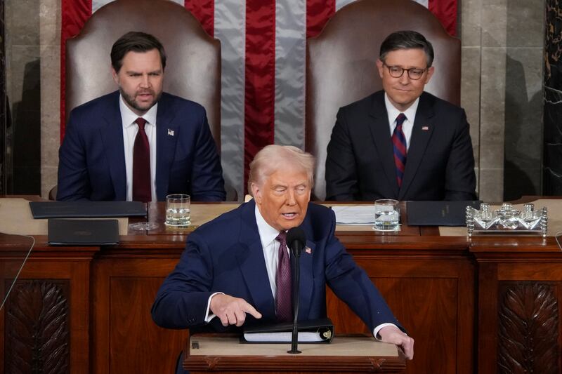 WASHINGTON, DC - MARCH 04: U.S. President Donald Trump addresses a joint session of Congress at the U.S. Capitol on March 04, 2025 in Washington, DC. Vice President JD Vance and Speaker of the House (R-LA) applaud behind. President Trump was expected to address Congress on his early achievements of his presidency and his upcoming legislative agenda. (Photo by Andrew Harnik/Getty Images)Getty Images