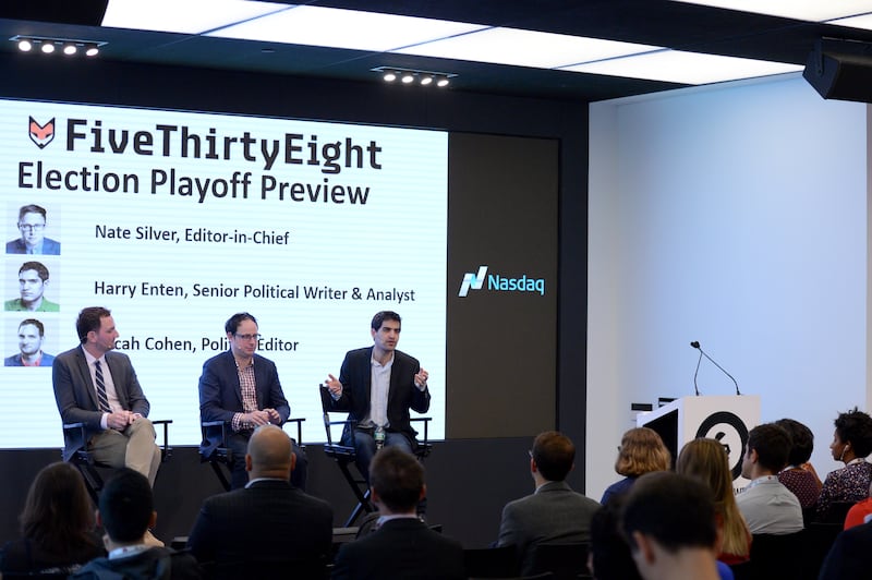 FiveThirtyEight Politics Editor Michah Cohen, FiveThirtyEight Statistician, Author and Founder Nate Silver, and FiveThirtyEight Senior Political Writer and Analyst Harry Enten speak onstage in 2015.Andrew Toth/Getty Images