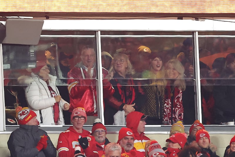 Taylor Swift reacts after a score by the Kansas City Chiefs during the fourth quarter against the Buffalo Bills in the AFC Championship Game at GEHA Field at Arrowhead Stadium on January 26, 2025 in Kansas City, Missouri.David Eulitt/Getty Images