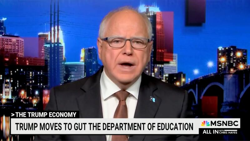 Minnesota Gov. Tim Walz, the Democratic nominee for vice president last year, talks about Trump and his trade wars, on MSNBC’s All In on Wednesday.MSNBC