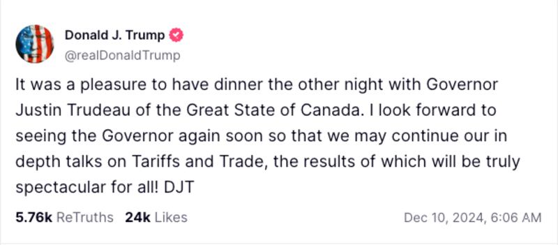 This was “ it was a delight to have dinner party the other dark with governor justin trudeau of the great state of canada , ” hewroteon truth social , ostensibly look up to his gag about canada becoming the 51st u.s. country a late dinner party at mar - a - lago .
