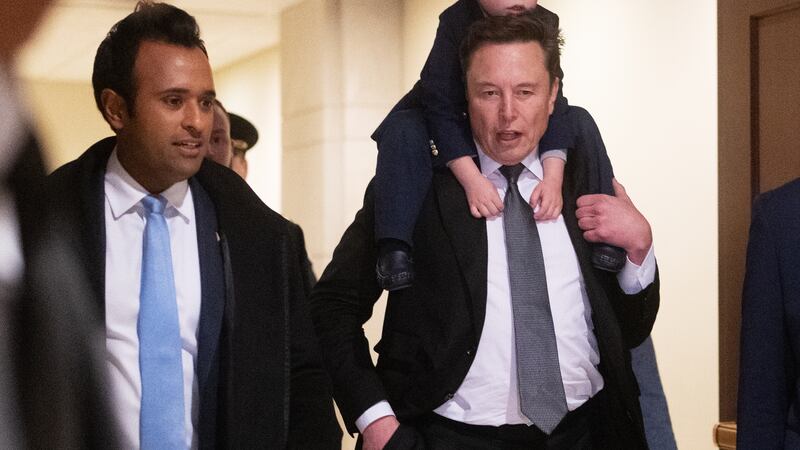 Vivek Ramaswamy and Elon Musk, with his son X, depart the Capitol building in Washington, DC on December 05, 2024.Craig Hudson for The Washington Post via Getty Images